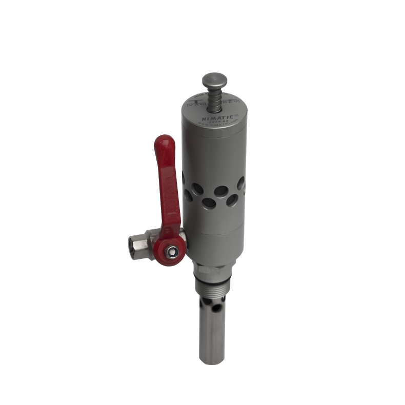 The Nimatic NRC-200 is powered by compressed air. Tested by reversing to a Max. pressure in the barrel of 0.25 Bar (at 2.5-10 Bar input). This pressure is secured with a Pilot valve which is pre-adjusted from Nimatic. Pilot valve must be checked regularly to ensure correct pressure. Checking is easily done by removing the top and pressing with a finger to see if the pilot valve operates freely.